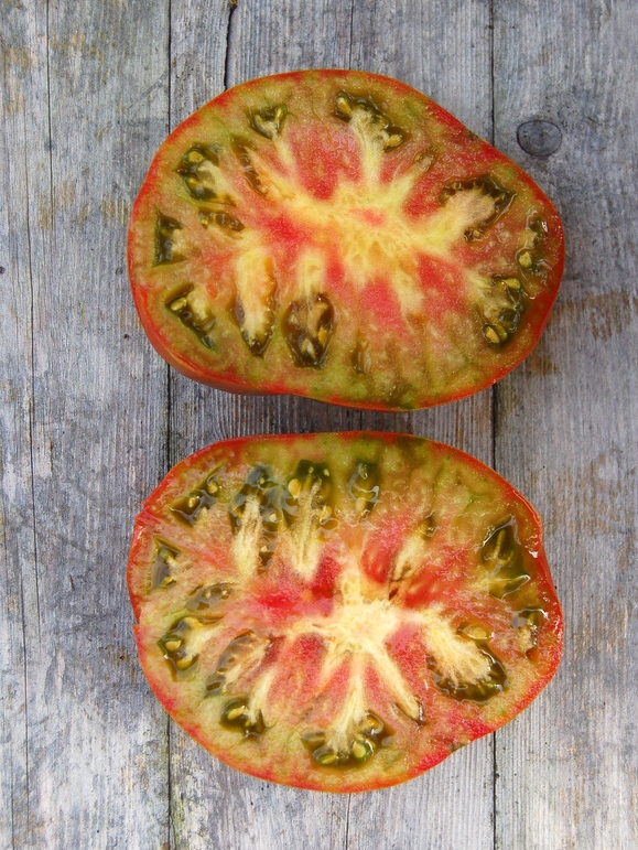 Tief burgunderrotes Fleisch mit wenigen Kernen, perfekt fürs Butterbrot, auch weil die Früchte nicht so saftig sind wie manch andere Fleischtomatensorten. Ihr Ursprung liegt in Kanada. Die Tomaten werden groß (ca. 350 Gramm), sind flachrund, etwas gerippt mit sortentypisch grünen Schultern. Sie kommt gut mit kälteren Temperaturen zurecht und hat sich recht robust gezeigt.