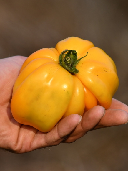Eher zufällig ist diese ausgewogen schmeckende Sorte aus Sibierien in unsere Sammlung gekommen und nun wollen wir sie nicht mehr missen. Die Pflanzen werden sehr hoch, können mehrere Triebe vertragen und bilden Unmengen sonnengelber Früchte. Das Laub ist kartoffelblättrig, also eine Rarität. Die Ernte setzte früh ein und dauerte 2020 sogar bis in den November.