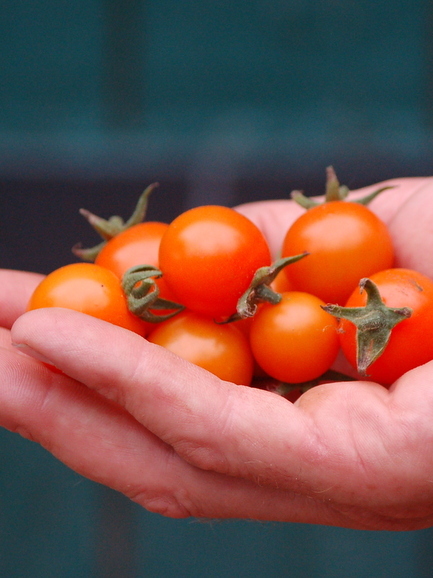 Eine produktive, eher späte Zwergtomate mit knallorangefarbenen großen Kirschtomaten, die eine schöne, glattglänzende Schale haben. Die Tomaten tragen lange, hier gab es Früchte bis zum ersten Frost. Außerdem haben sich die niedrigwüchsigen, kompakten Pflanzen als sehr trockenheitsresistent gezeigt.